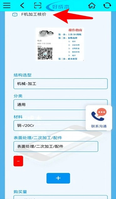 在手工核价页面,可选择结构类型、材料、表面处理等参数,填写完成后继续下一步操作。