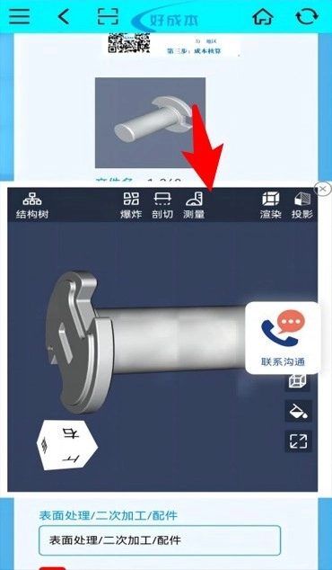 5、点击模型图进入预览界面,在工具栏中找到“测量”按钮并点击,即可查看零件的详细尺寸数据。