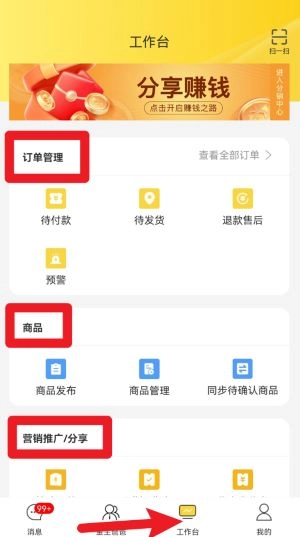 3、点击底部的“工作台”按钮,进入该页面后,可开展订单管理、商品发布、商品同步以及营销推广等相关操作。
