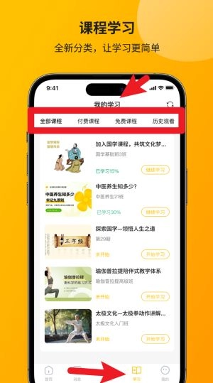 4、进入“我的学习”页面可查看所有课程的进度情况,同时支持按已学课程和未开始课程进行分类查看,有助于用户更有条理地开展系统学习。