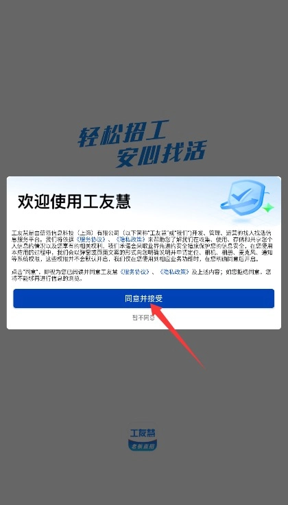 1、首次使用时,请仔细阅读平台的服务条款和隐私政策,确认无误后点击同意按钮,即可进入应用。