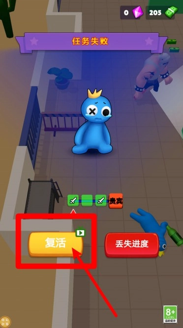 3.任务失败处理:当角色被击倒后,游戏会进入失败画面,此时玩家可以选择点击“复活”按钮,通过观看广告来继续游戏进程,从而无需重新开始挑战。