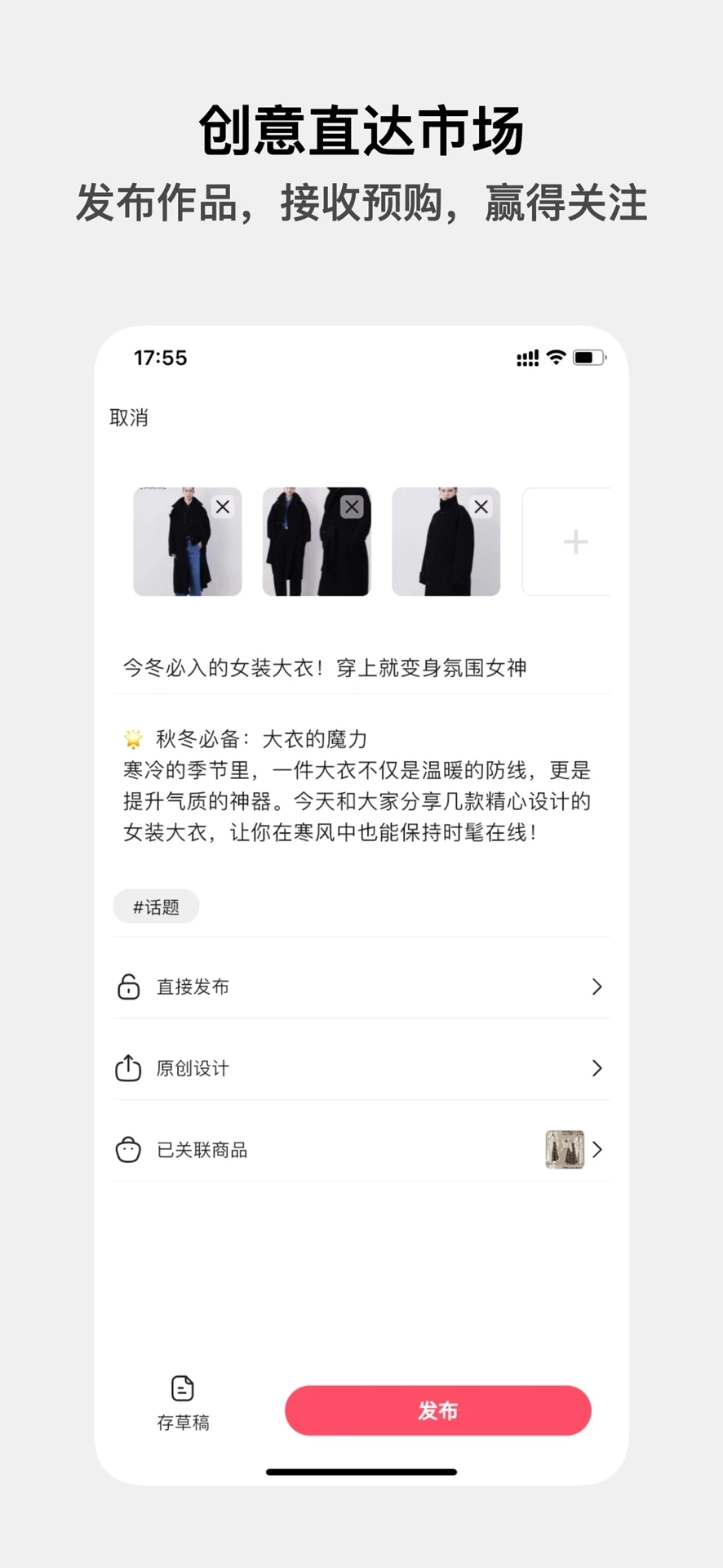 设计师们在衣择平台发布独树一帜的作品,用户能够在此预购最新设计,借助最前沿的时尚单品为生活增添亮色。衣择不只是一个购物平台,更是时尚灵感的策源地,引领你探寻每件服饰背后的故事与巧思。