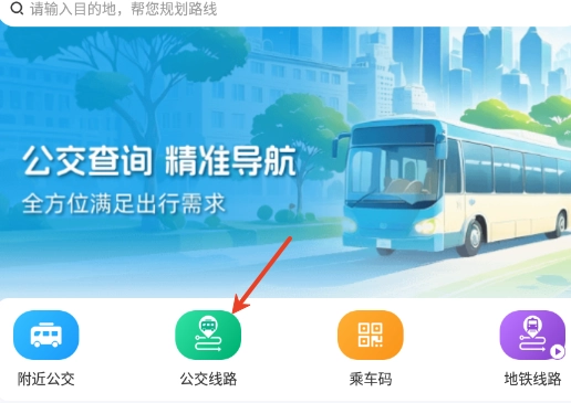 1、用户能够迅速进入首页,在首页里找到“查询路线”功能。