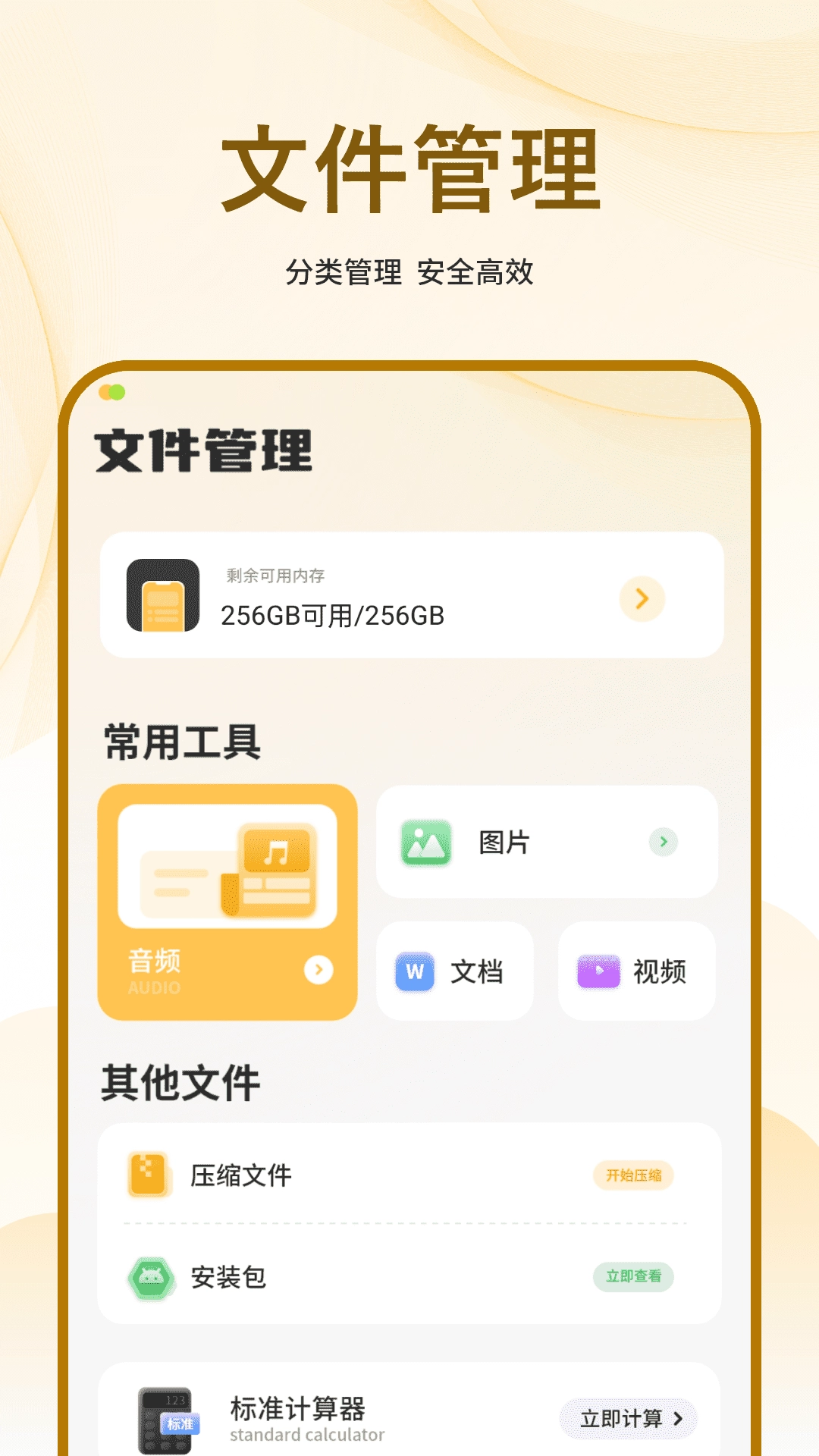 1、查看手机文档的内容,可进行名称、日期、大小的排序; 2、一键查看手机的视频,照片,音乐等内容; 3、手机解压文件,更快的查看文件; 4、标准计算器,科学计算器,让计算不在麻烦; 5、查看手机可用空间和具体文件;