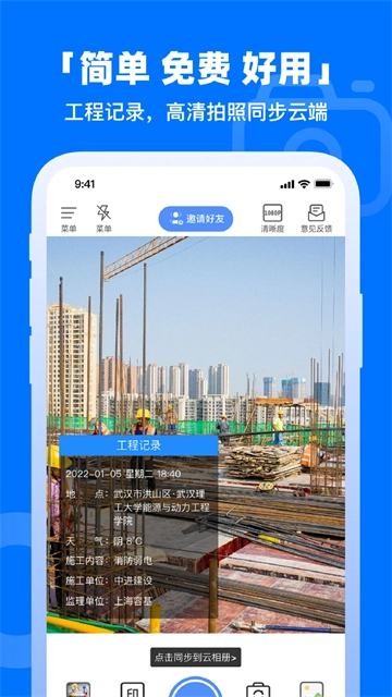 1、工程记录操作简单快:打开应用直接拍摄顺,系统自动添加防伪水印准,无需复杂设置快速完成记录好。