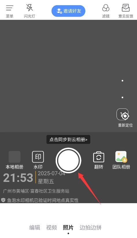 3、进入拍摄界面后点击底部圆形快门按钮,即可拍摄自动添加水印的个性化照片。