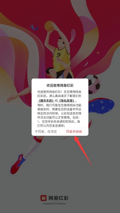 1、初次使用需阅读平台服务条款与隐私政策,确认后点击同意并继续进入应用。