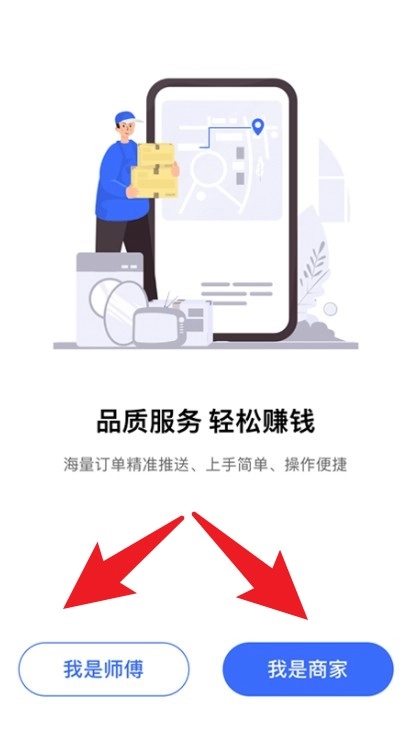 1. 选择身份:首次进入App时可选择“我是师傅”或“我是商家”,确定身份后进入相应界面。