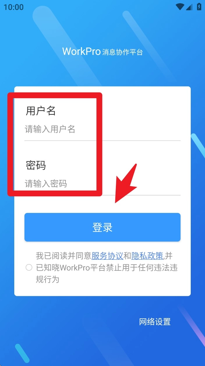 1. 打开 App 进入登录页,输入用户名与密码后点击「登录」,即可进入工作平台首页。