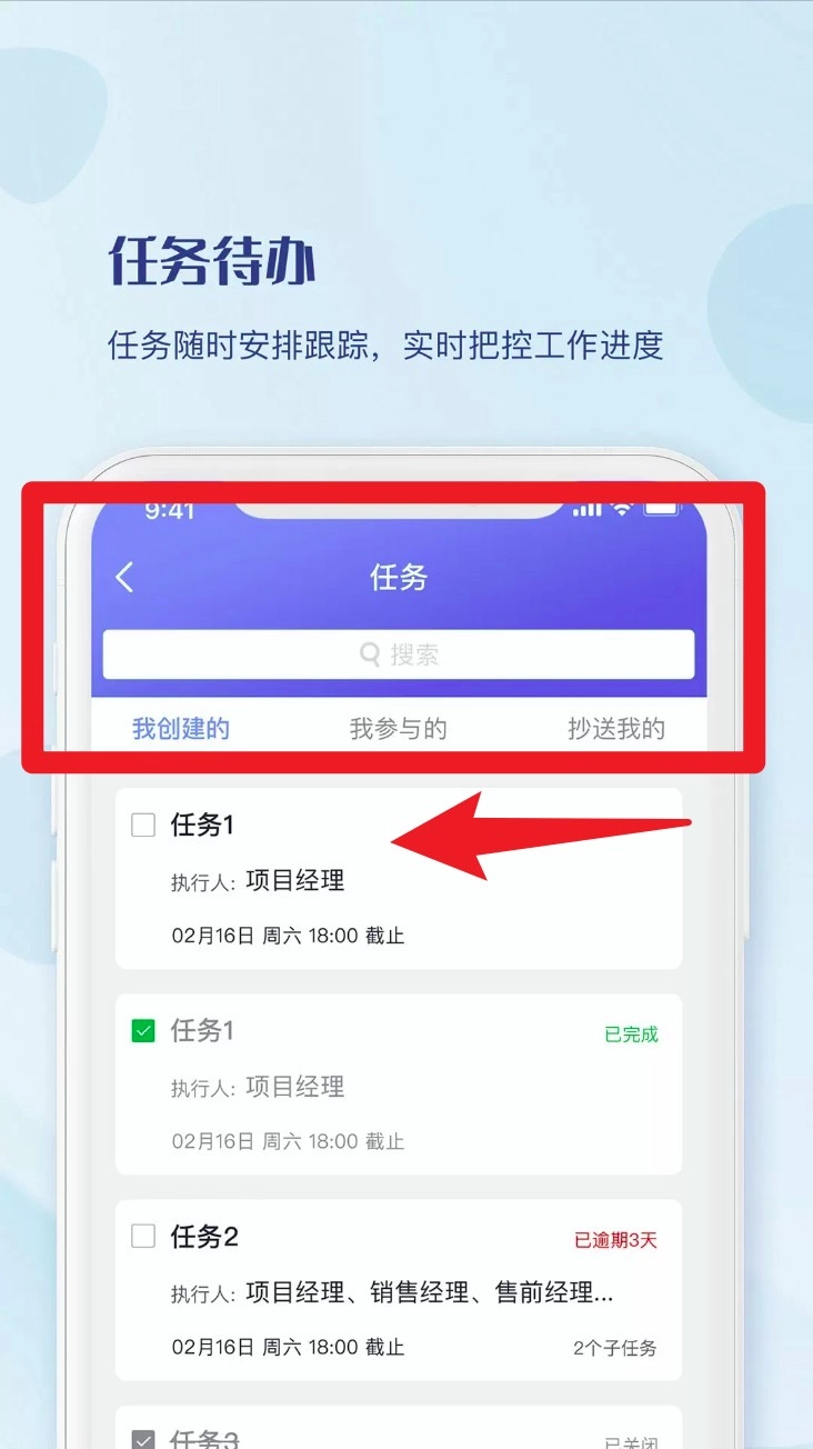 2. 点击「任务」模块,查看待办任务清单,支持按照我创建的、我参与的等分类筛选。