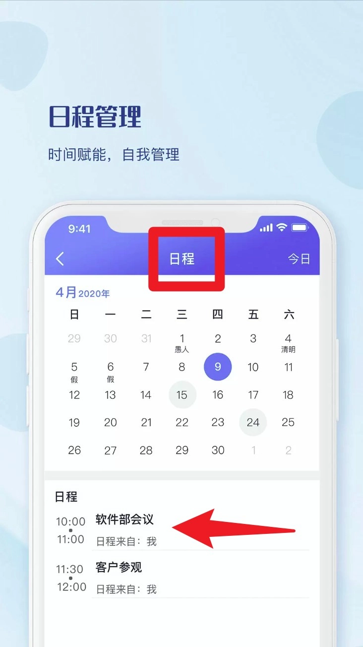 3. 进入「日程」界面,可快速查看每日安排,点击具体时间段可添加会议或提醒事项。