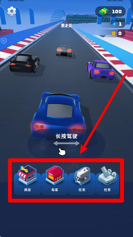 1.赛车起步界面:点击屏幕中央提示“长按驾驶”按钮即可开始比赛,左右滑动控制赛车方向,长按即可加速冲刺,快速投入激情竞赛中。