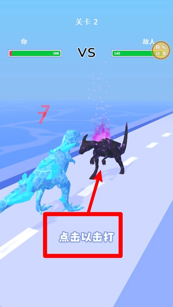 1. 点击攻击按钮后,待恐龙完成进化即可进入对战环节,届时恐龙将与敌人进行正面对决,点击速度越快,造成的打击伤害就越高,也就越容易取得胜利。
