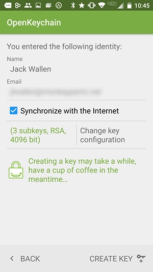 1. 打开OpenKeychain的主界面,找到并点击“创建我的密钥”按钮,接着按照创建向导的提示一步步完成后续操作。