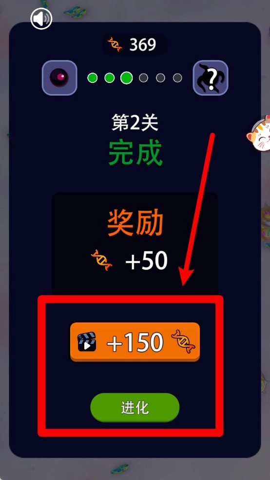 1.奖励结算界面:每完成一关即可获得基因奖励,可选择加倍领取帮助角色快速成长进化。