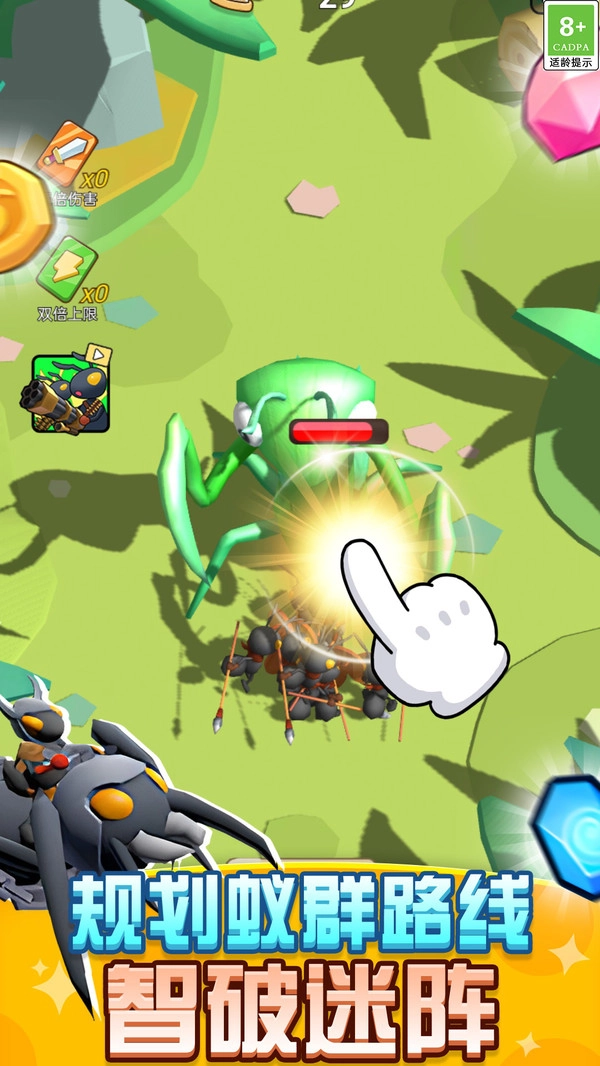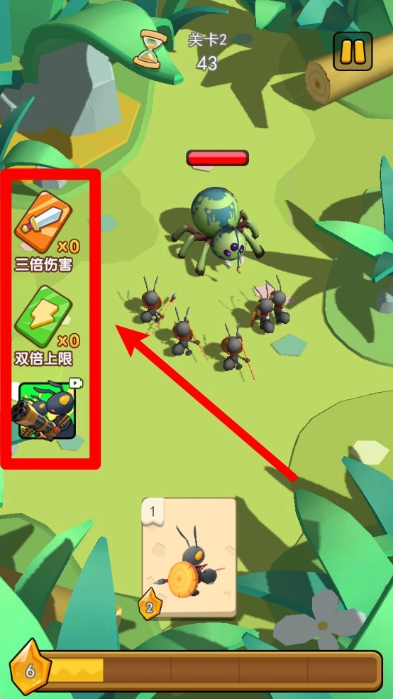 在战斗进行时,玩家能够借助左下角的技能卡来提升蚂蚁的能力,像三倍伤害、双倍上限这类技能都可以运用。