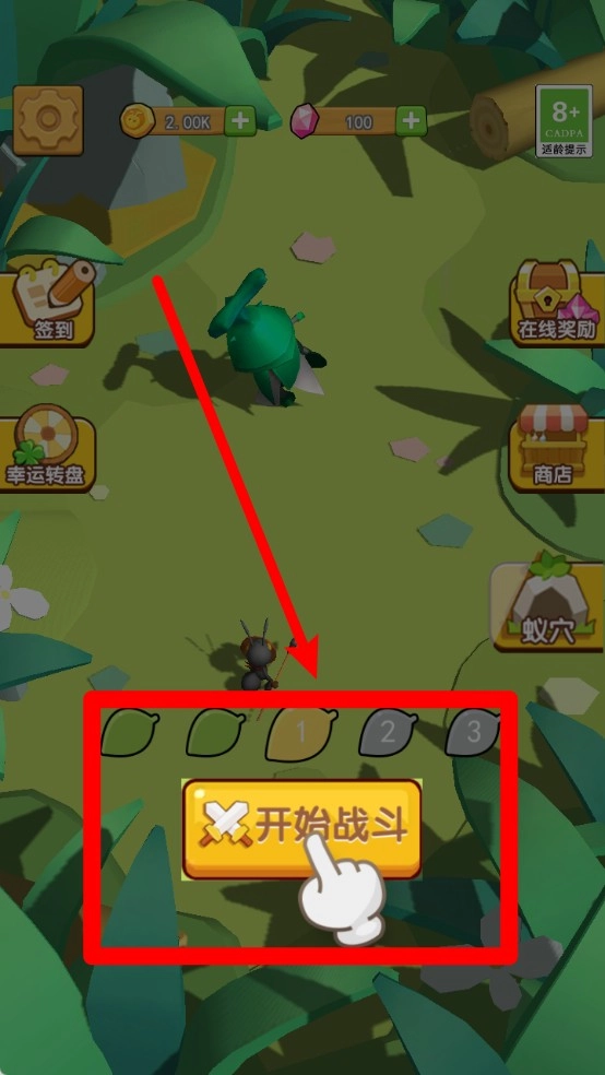 1. 玩家在游戏主界面点击“开始战斗”按钮,即可进入战斗场景,准备指挥蚂蚁军团展开战斗。