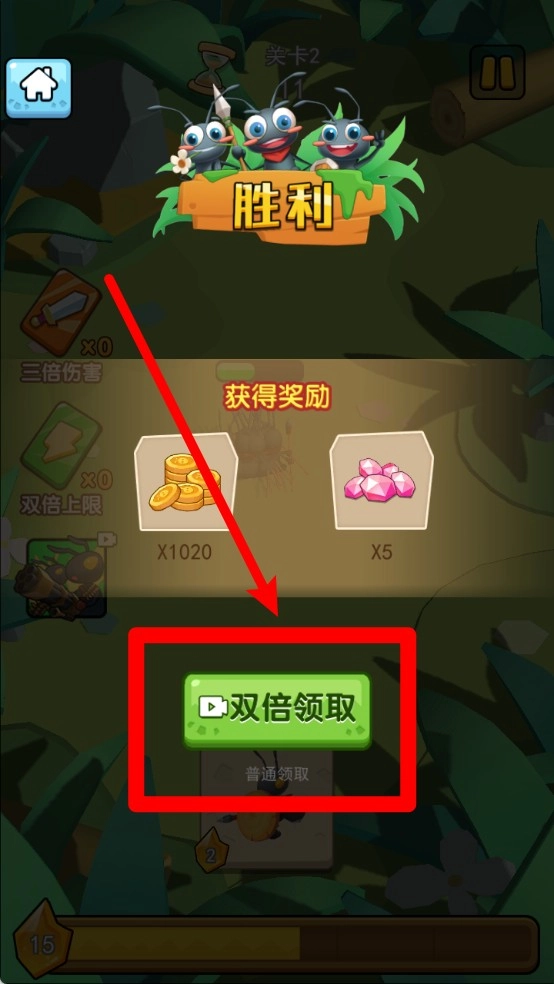 3.玩家在获胜后会得到金币与宝石作为奖励,若观看广告则能获取双倍奖励,以此加快游戏的发展进程。
