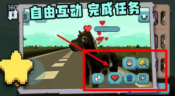点击右侧的互动图标,就能对动物进行抚摸、喂食、骑乘等多种行为操作;互动成功后,不仅会触发爱心动画,还可能解锁支线任务。