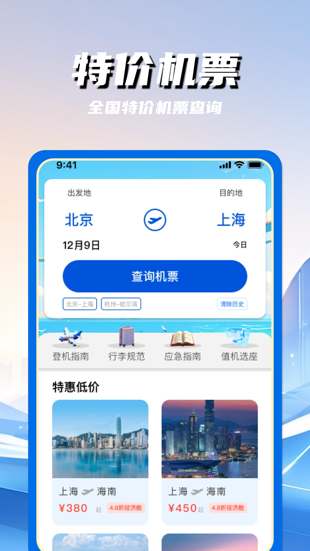 特价航空班机票查询软件是一款专注于特价机票查询的手机应用,核心功能为特价机票查询,同时包含航班信息查询、价格对比、行程管理、乘机资讯浏览等服务,为用户出行提供多方面支持,通过全面的乘机资讯与行程管理功能,使出行更加便捷顺畅。
