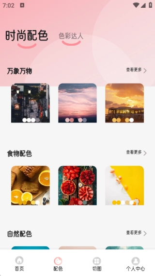 在时尚配色的相关内容里,设置了万象万物、食物配色、自然配色等不同版块,能够让大家随时体验各类配色方案。