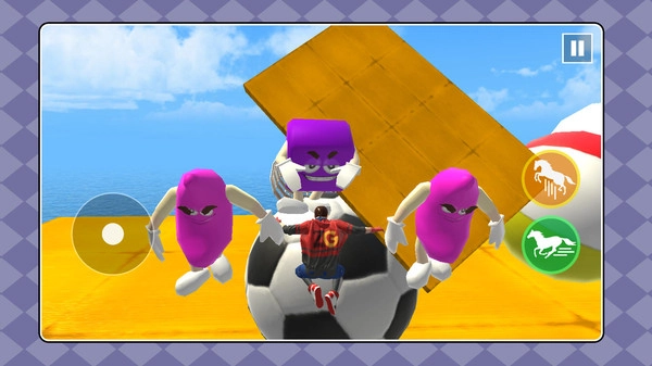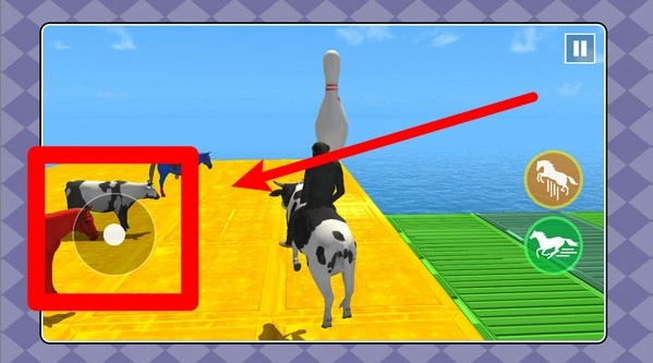 2. 赛道左下方的半透明摇杆用于操控行进方向,骑牛冲刺过程中要灵活调整方向以躲避障碍,同时撞击巨型保龄瓶可获得奖励。