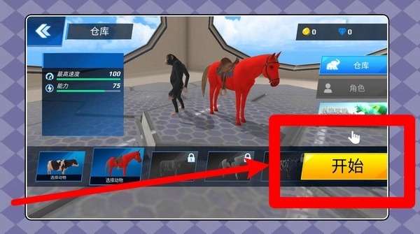 1. 在仓库界面滑动就能挑选动物坐骑,选好后点击右侧的开始按钮,就能马上进入赛道,继续这段刺激的突围之旅。