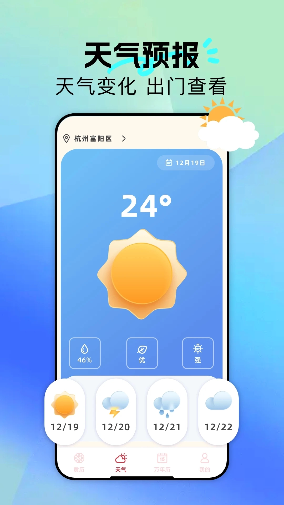 1、除了基本的日历功能,黄历通解还集成了天气预报模块,提供未来一周的天气动态,包括温度变化、降水概率等。
