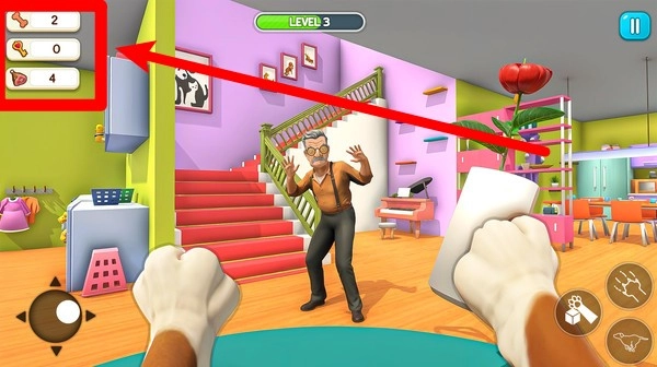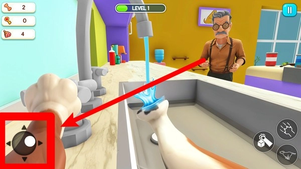 1. 摇杆移动操作:借助左下角的棕色圆形摇杆,能精准调节视角和移动位置,操控角色冲到水槽下方清洗脏爪子,以此避开严厉老爷子的训斥。