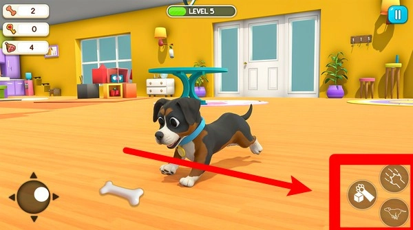 2.互动技能面板:点击右下三个圆形按钮切换拍爪扑咬等动作,把骨头丢在前方引导小狗开心扑向目标。