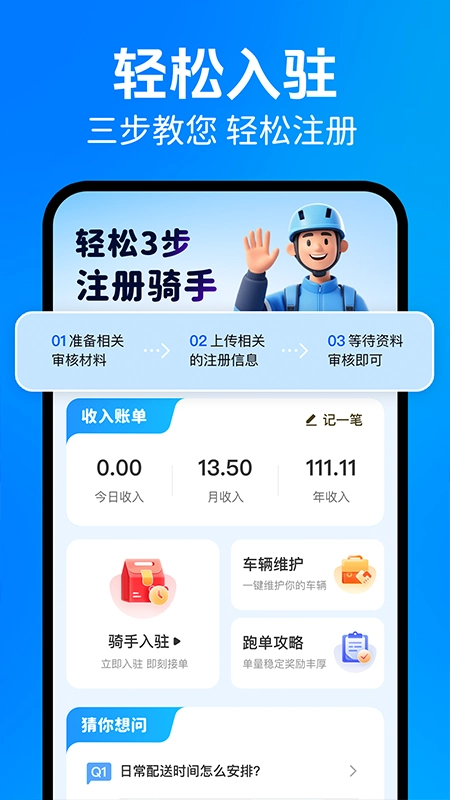 1、新手入驻流程简单,仅需准备材料、上传信息、等待审核三步,即可轻松注册成为平台骑手。