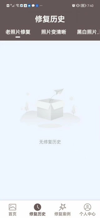 首页配备了智能修复老照片与照片变清晰这两项热门修复功能,此外还包含智能修复等其他功能。