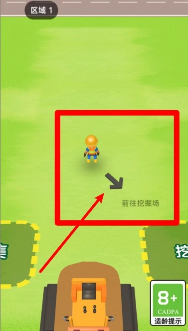 2. 画面中的指示标记指向挖掘场的方向,当角色移动到该区域后,会自动进入地下作业区域进行采矿作业。