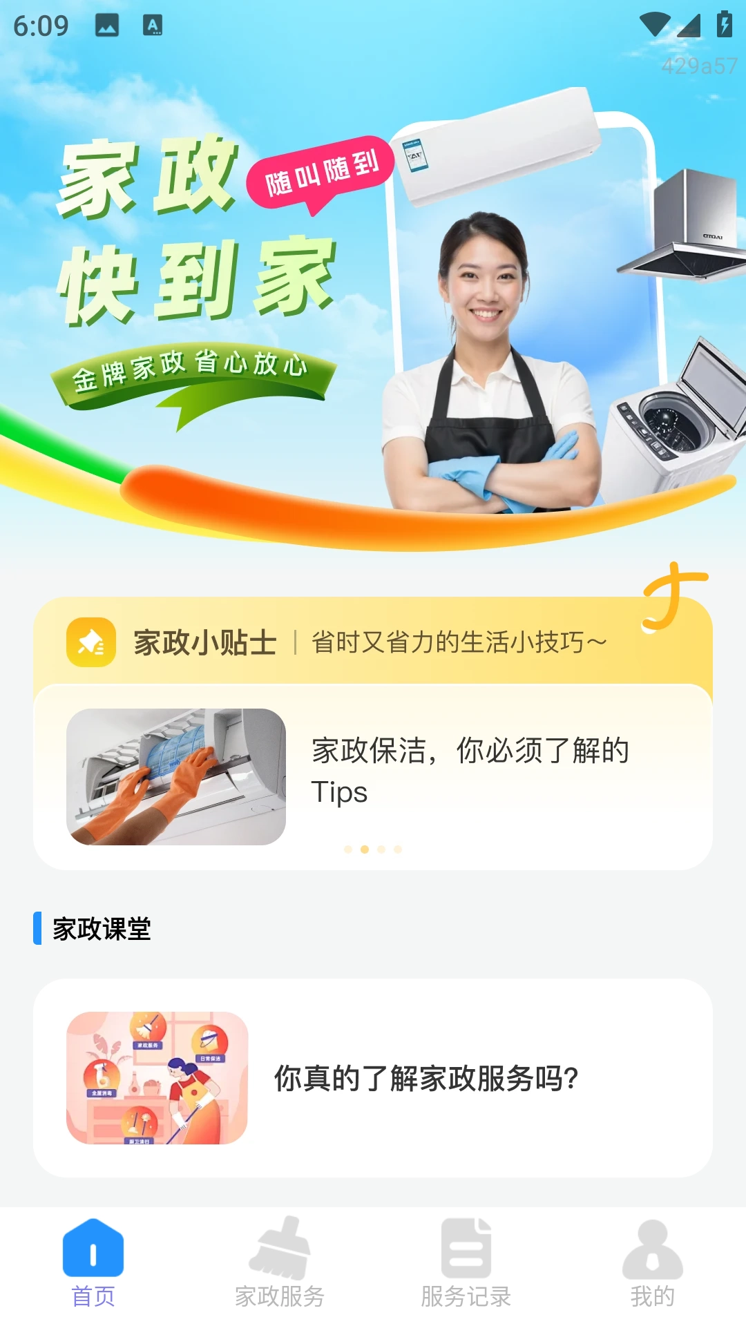 3、首页整合了家政小贴士和家政课堂,为用户提供丰富的家政知识。
