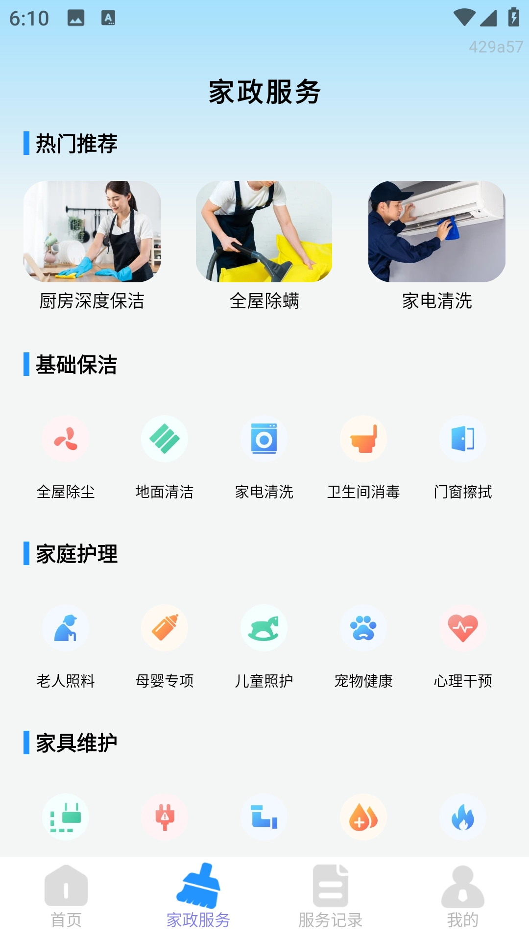 3、下方导航栏中的家政服务板块,包含了各种服务需求,点击自己需要的即可下单。