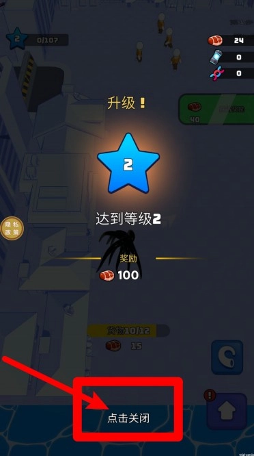 1.升级提示:当达到新等级时,界面中央会弹出升级提示,显示当前等级与奖励数量,玩家点击下方按钮即可关闭并继续游戏。