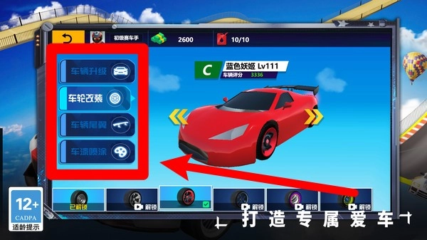 3.个性改装:玩家可在车库中为赛车升级、改装轮胎或尾翼,自由打造专属爱车,提高赛车性能,迎接更高难度挑战。