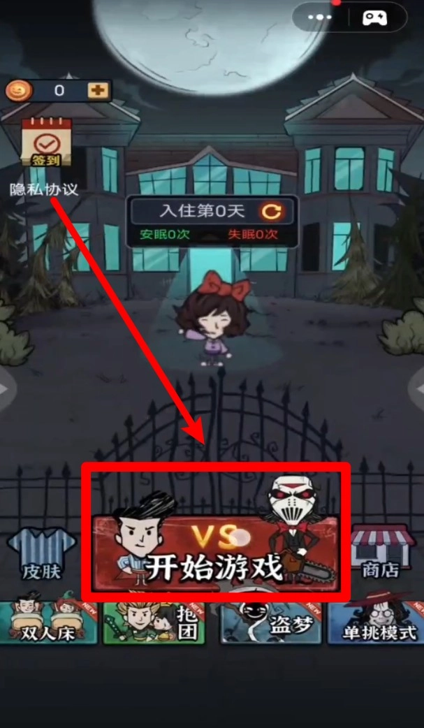 1.主界面显示入住天数与安睡次数,点击“开始游戏”进入对局;下方模式包括双人床、抱团等,按喜好选择玩法。