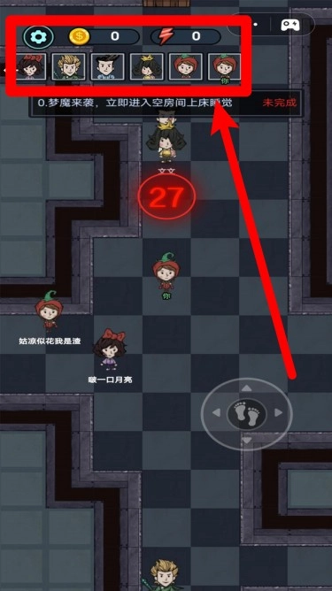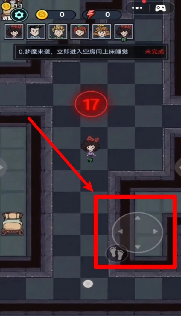 2.迷宫内右下为移动摇杆,红圈倒计时代表梦魔来袭;尽快找空房上床,利用走位与地形躲避追击。