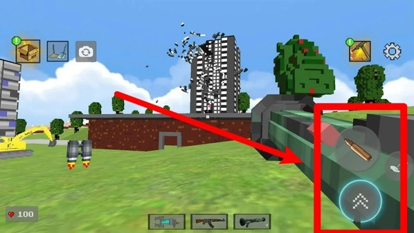2.使用右下角的射击按钮发射武器,玩家可在像素战场中精准攻击目标,摧毁建筑或敌人完成战斗任务。