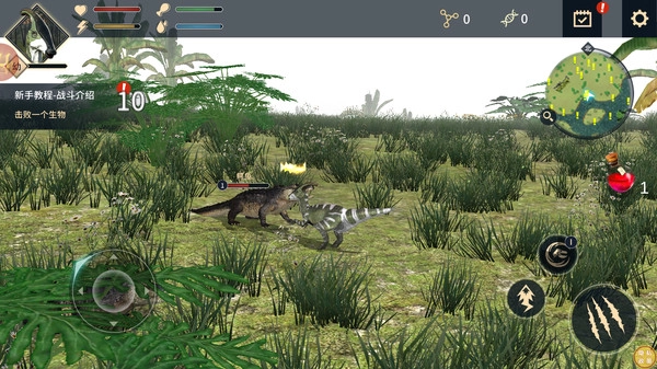 1.使用左下角虚拟摇杆操控恐龙移动,在地图中探索环境并寻找食物或敌人,满足基本生存需求并保持良好状态。