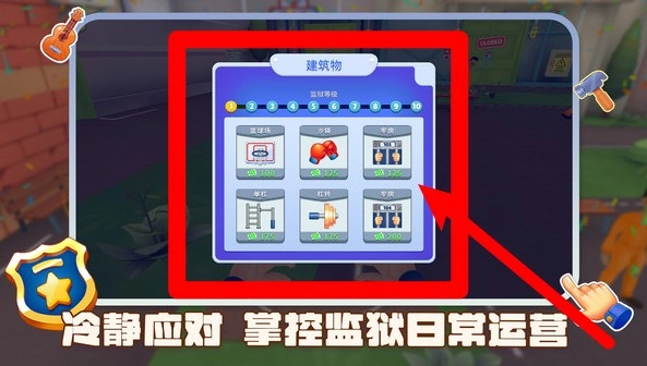 1.建筑系统:界面中展示了监狱的建筑物升级与建造选项,玩家可通过合理规划建设来提升监狱的运作效率与安全等级。