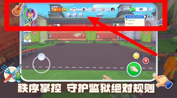 2.任务进度:上方任务栏显示了每日目标与进度,玩家需要按顺序完成相关操作,保证监狱秩序并稳步推进游戏发展。