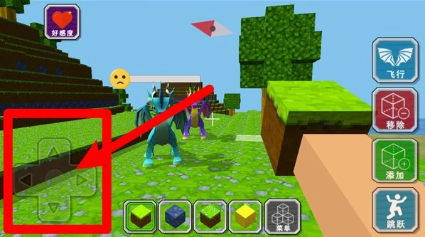 1.界面右侧功能键包含飞行移动添加跳跃等操作,玩家可自由切换动作,在像素化大地上尽情探索并灵活展开创造与冒险体验。