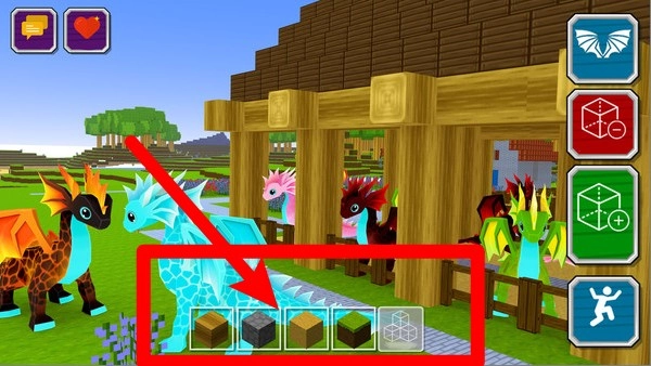 3.下方方块栏可自由选择木材石块等建材,玩家能发挥想象力建造房屋农场和龙舍,打造独一无二的奇幻世界并实现创造梦想。