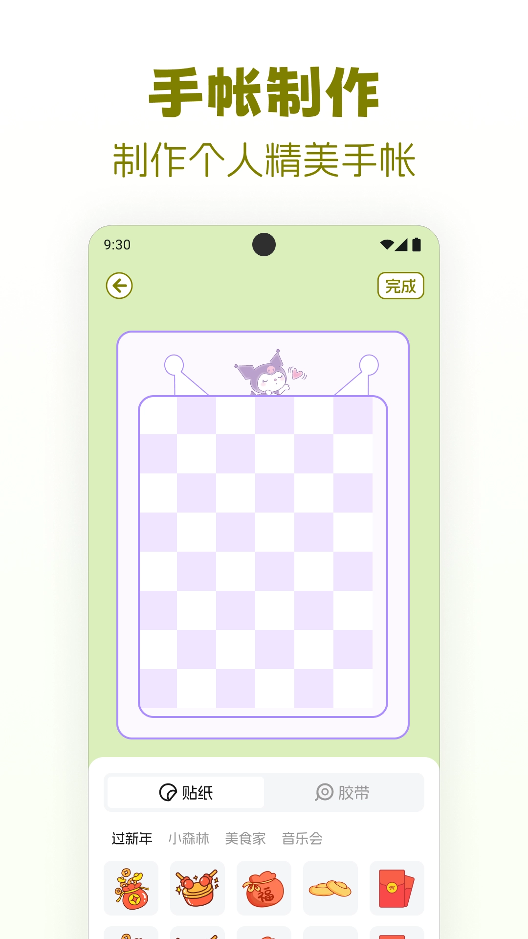 1、整合贴纸挑选、色彩填涂、背景组合、便签记录等功能,为用户打造一站式手帐创作体验。