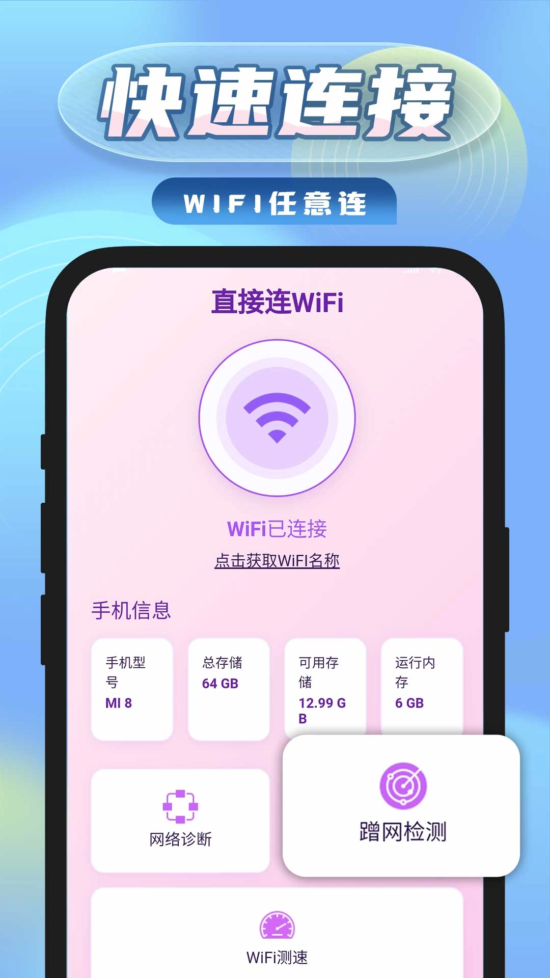 直接连WiFi软件是一款能轻松协助用户进行手机信号连接的应用,它会为用户优先筛选信号强度高的网络,只需一键操作就能快速完成连接,还具备手机网络诊断功能,可全面获取多种信号资源。
