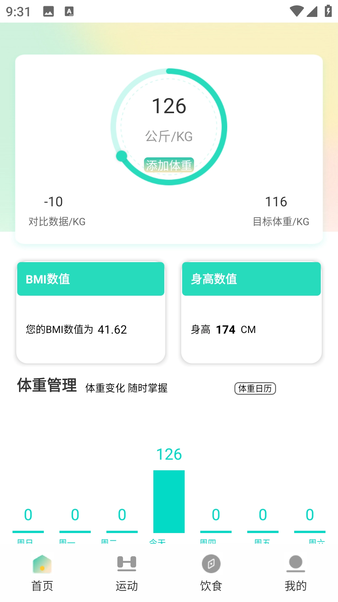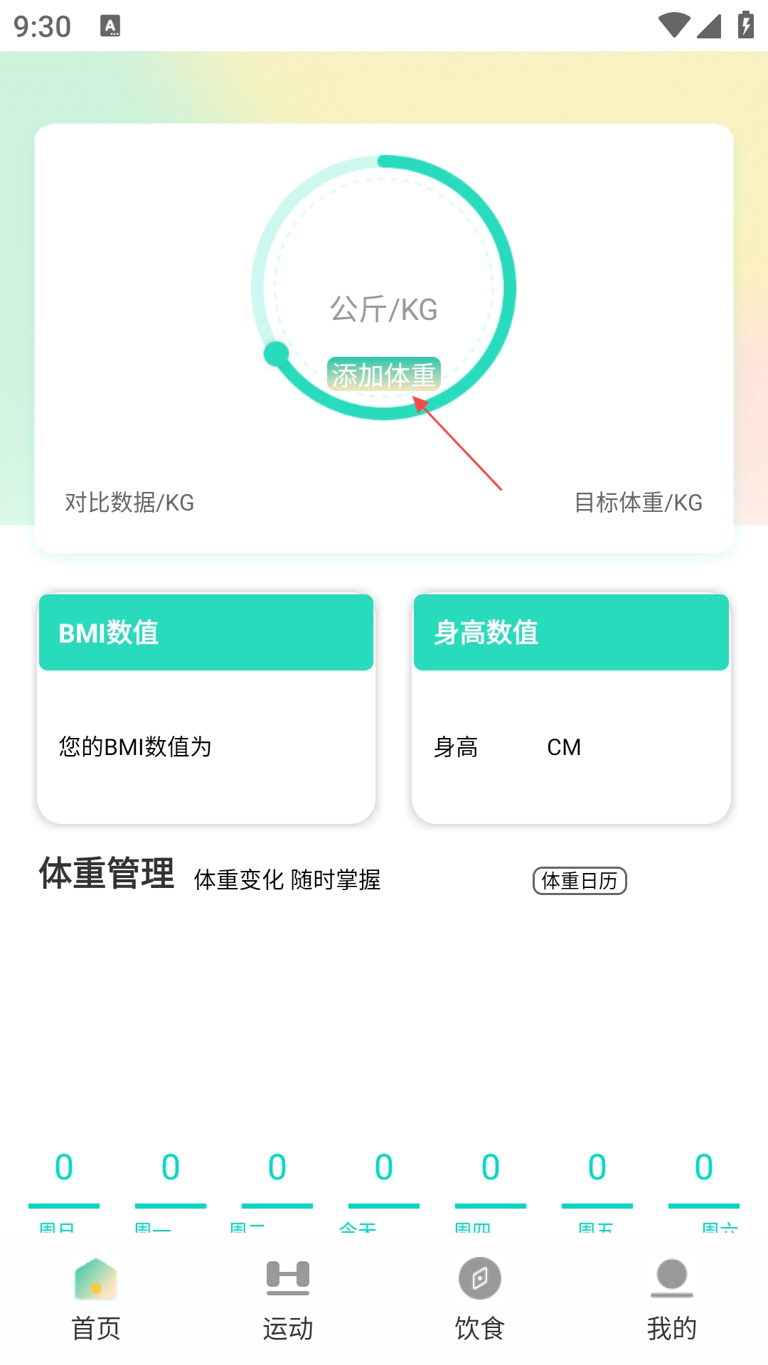 2、点击“添加体重”图标,输入身高与体重的数值后,软件会自动计算并显示BMI数值。
