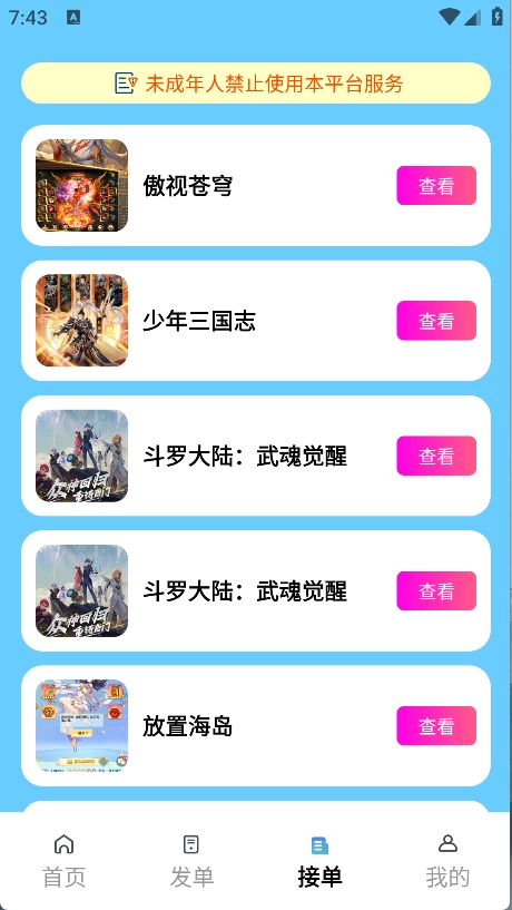 3、在接单页面里找到你有意向接单的游戏查看详情,接着点击“我要接单”就能开启代练服务了。